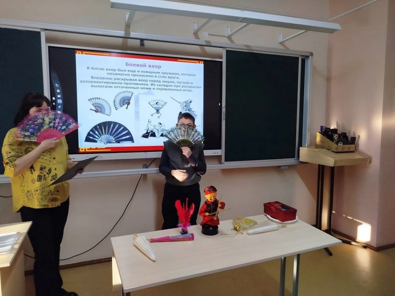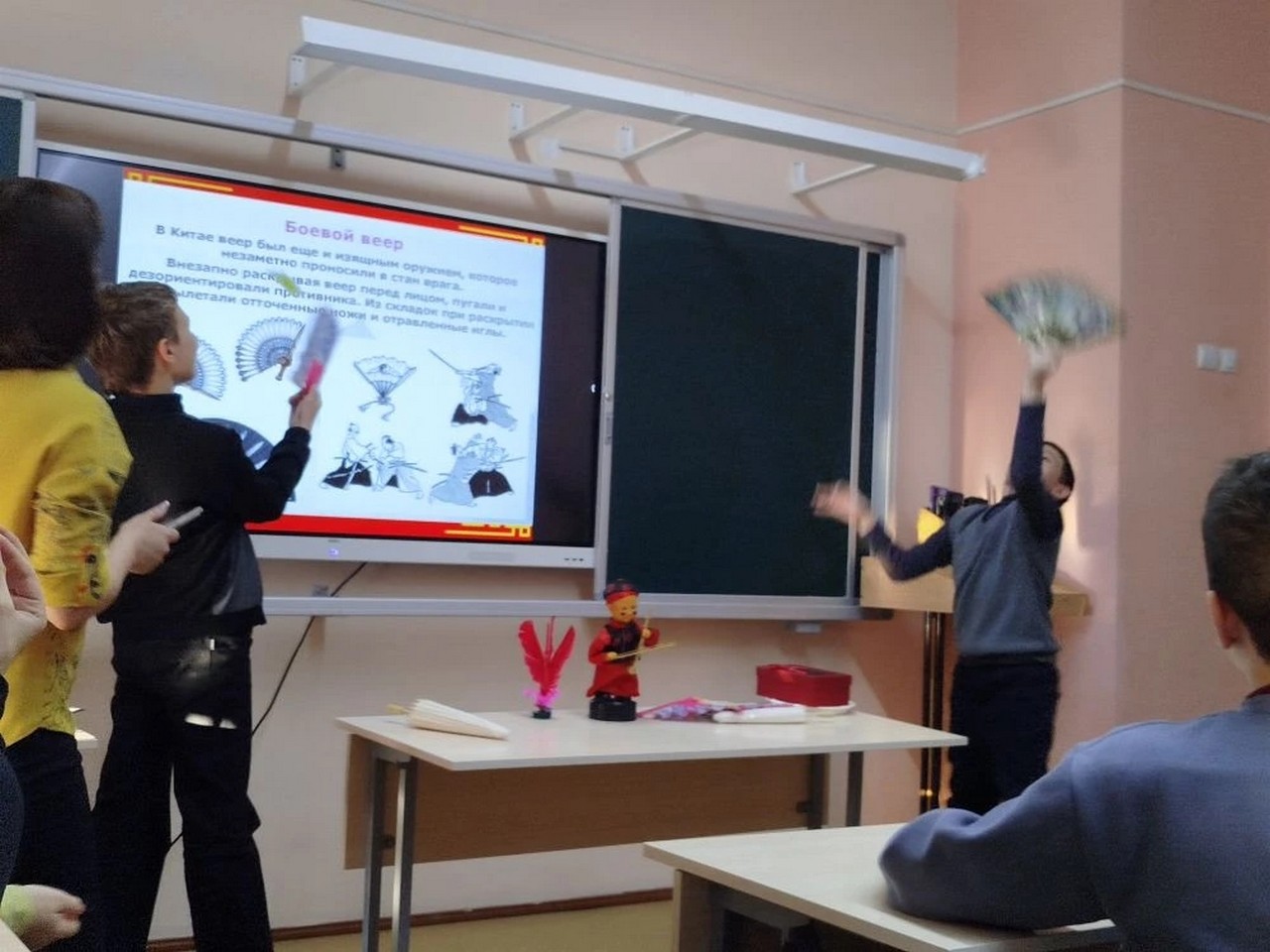 В завершение мероприятия школьники попробовали «говорить» на языке жестов при помощи вееров, с удовольствием сыграли в игру с веером и пёрышком, китайскую народную игру с воланом «Цзяньцзы», которая до-словно переводится как «пинай волан». Ребята так увлеклись, что продолжили игры на перемене.
