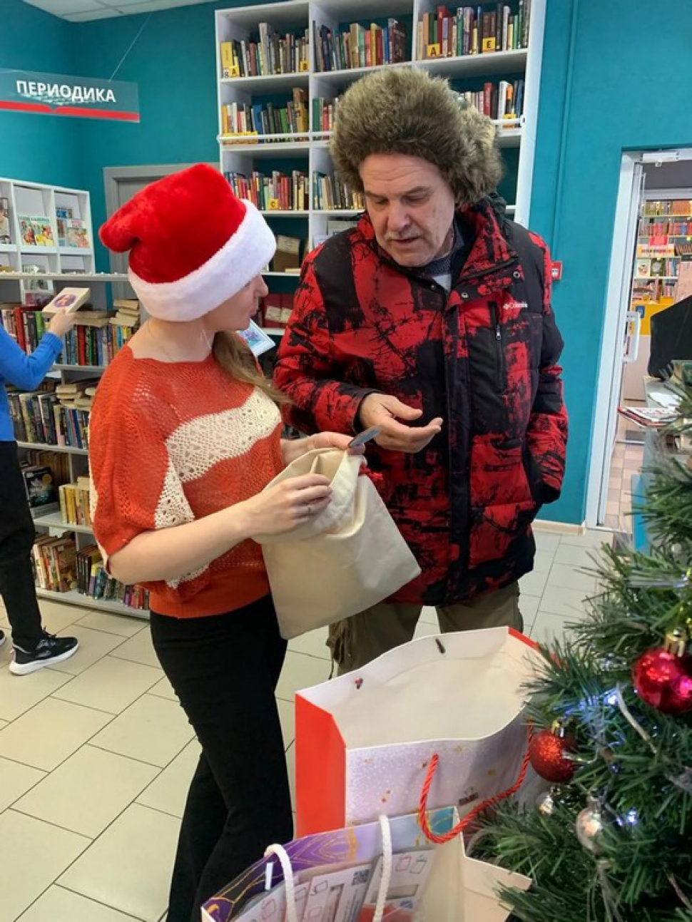 Участники акции доставали из новогоднего мешочка снежинки, на которых было указано название выигрышного подарка. Атмосфера праздника и предвкушения сюрприза создала особое настроение и сделала визит в библиотеку по‑настоящему запоминающимся.