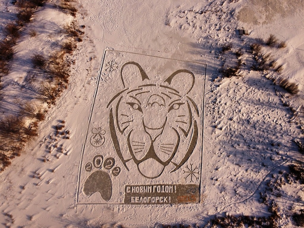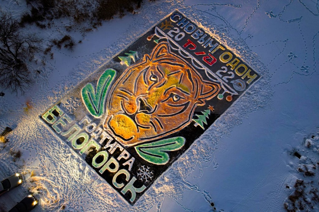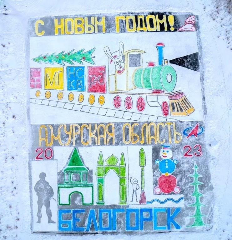 Вот уже более пяти лет команда железнодорожников и активных жителей города «рисует» радующие глаз ледовые композиции на льду замерзших озер у главной железной дороги России. И каждый год ледовые художники из Белогорска стараются удивить своей картиной. Так, в 2023 году они создали 3D-открытку – и на льду появился выныривающий прямо из замерзшего озера дракон. До этого они «рисовали» символы Амурской области, в 2021-м – яркого тигра. В 2024 году посвятили свою пятую юбилейную картину первому амурскому ледовому художнику Валерию Мельникову.
