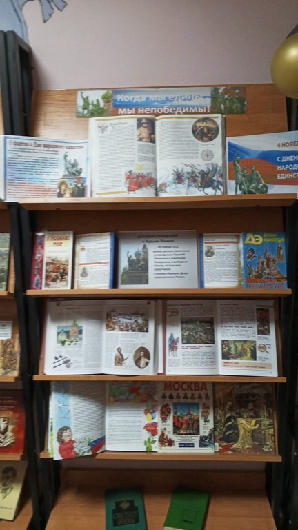 1 ноября 2025 года прошел обзор книжной выставки «Когда мы едины, мы непобедимы». Книжная выставка знакомит читателей с различными энциклопедиями, книгами по истории Отечества, рассказывающими о подвиге русского народа в те далёкие времена и о современном развитии российской государственности. Читателей познакомили с изданиями по истории, культуре, быту Руси того времени, а также с изданиями о великом русском князе Дмитрии Пожарском и национальном герое Кузьме Минине, о Казанской иконе Божией Матери.