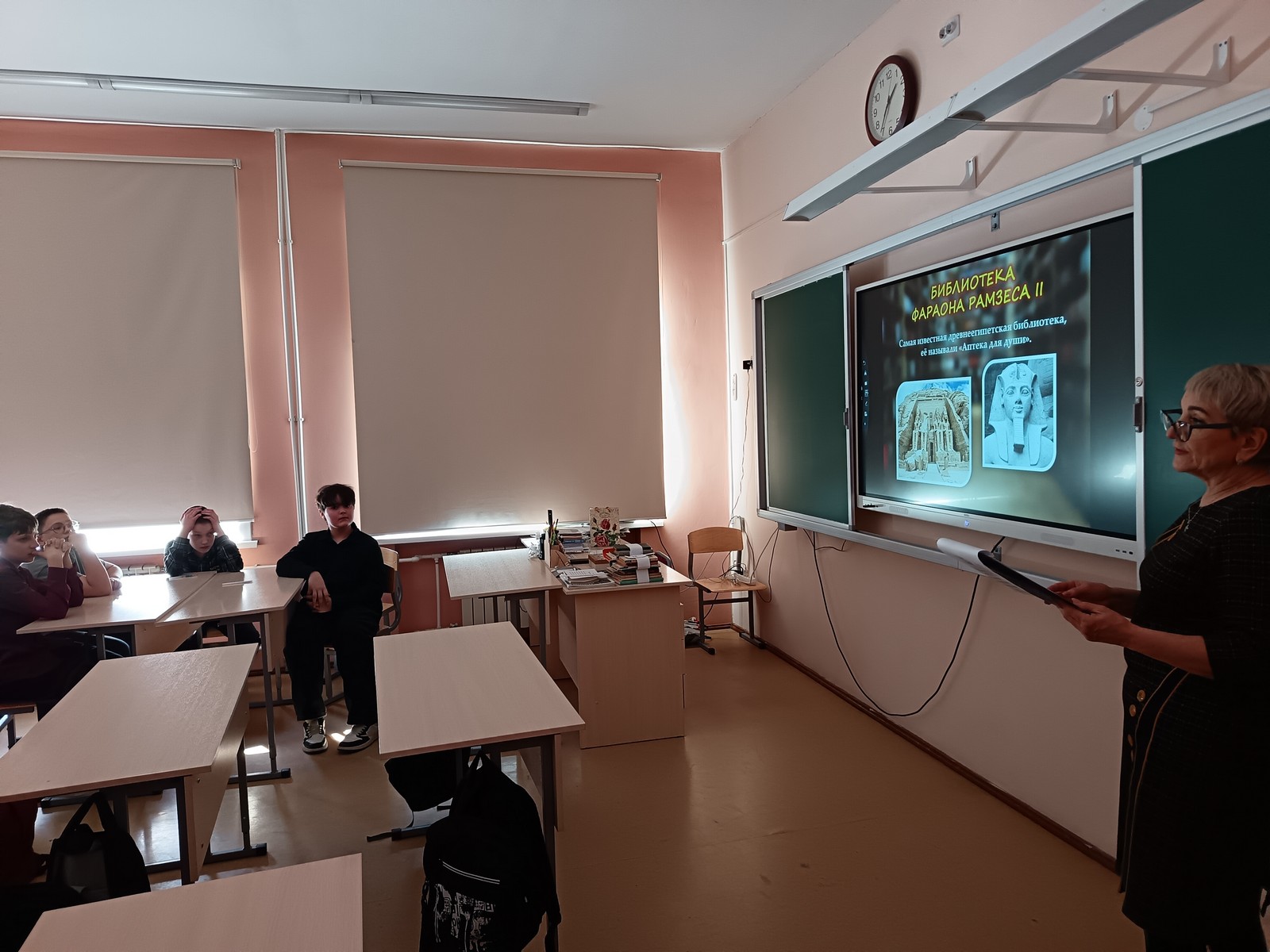 В начале мероприятия ребятам рассказали об истории появления библиотек. О наиболее известных библиотеках древности, таких, как библиотека царя Ашшурбанипала, где все книги были написаны на глиняных табличках; Александрийской библиотеке и монастырских библиотеках средневековой Европы, где обычно располагались и школы писцов, и мастерские по переписке книг. Ребята узнали о первой библиотеке в России, которая появилась в 1037 году при правлении Ярослава Мудрого в Киеве в Софийском Соборе. Рассказали учащимся о модельной библиотеке г. Белогорска. Где сегодня можно не только почитать книгу, но и присоединиться к интересному мастер-классу, пообщаться в кругу единомышленников, или просто прийти в библиотеку и поиграть в современные настольные игры.
