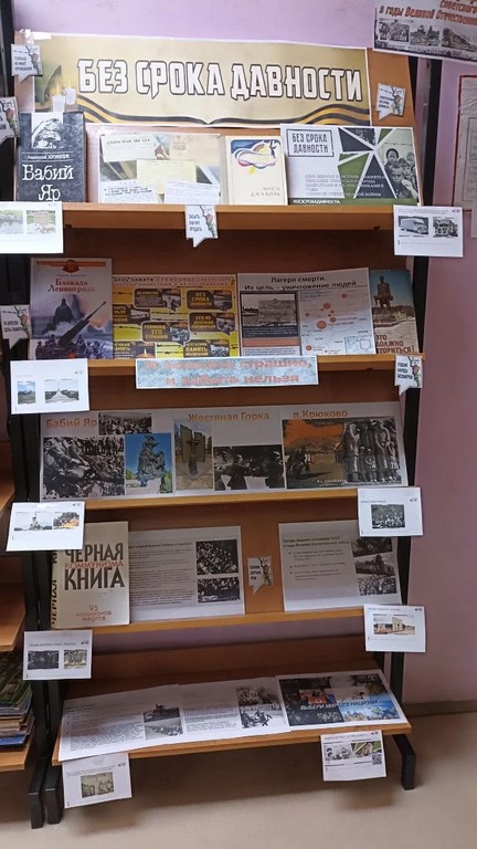 С целью сохранения у подрастающего поколения исторической памяти о жертвах нацистских преступлений в годы Великой Отечественной войны, в библиотеке – филиале №2 работает книжная выставка материалов, свидетельствующих о преступлениях нацистов против мирного населения на оккупированных территориях СССР в годы Великой Отечественной войны: «Без срока давности».