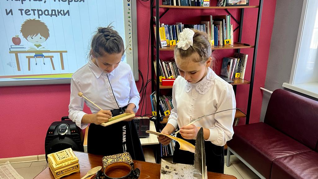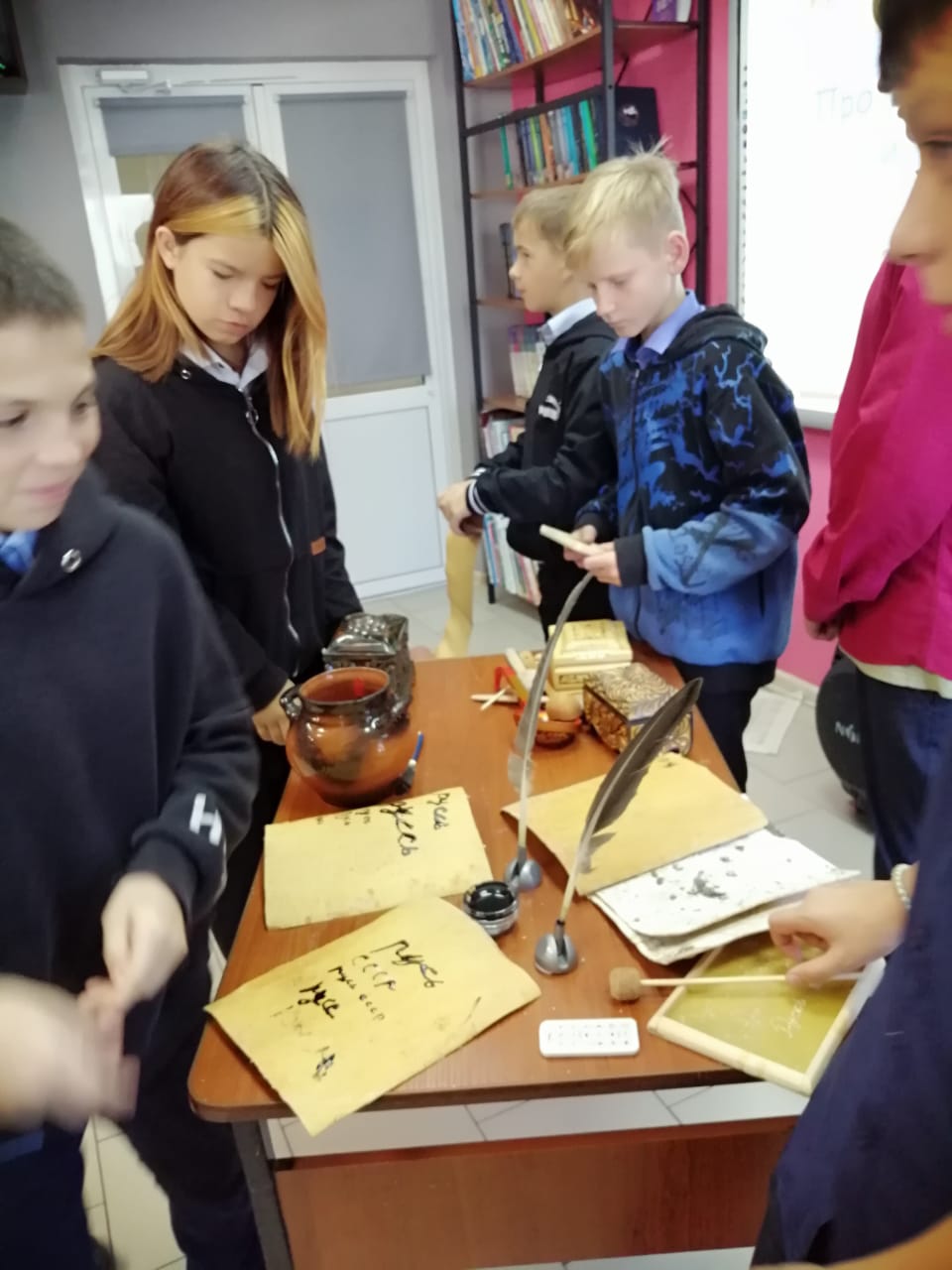 Архивный урок «История школы» состоялся 22 сентября в детско- юношеском отделе модельной библиотеки. Ребята узнали, откуда произошло слово «каникулы», сколько нужно съесть каши, чтобы называться «однокашниками», как появились в школе отметки. Дети внимательно слушали рассказ и с удовольствием пробовали писать гусиными перьями на бересте и писалом на восковых дощечках.