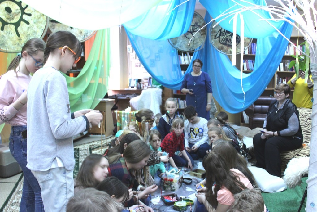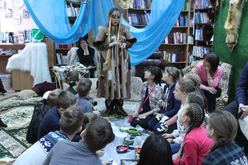 Читальный зал на время встречи перевоплотился в уютную «юрту» и присутствующие гости смогли путешествовать по родному краю в атмосфере национальной культуры коренного народа Приамурья – эвенков. Встречу начала ведущая в образе шаманки, затем хореографический номер образцового ансамбля эстрадного танца «Стиль» добавил национального колорита и общую гармонию праздника. Но самым ярким и незабываемым было выступление Елисеевой Дарьи и Колесовой Лидии, представительниц эвенкийского народа, которые приехали к нам с Зейского района п. Бомнак. Они предстали пред гостями в национальных костюмах и познакомили со своей культурой, пели песни, играли игры, показывали обряды, а в завершение на память о встрече изготовили со всеми присутствующими амулеты на счастье.