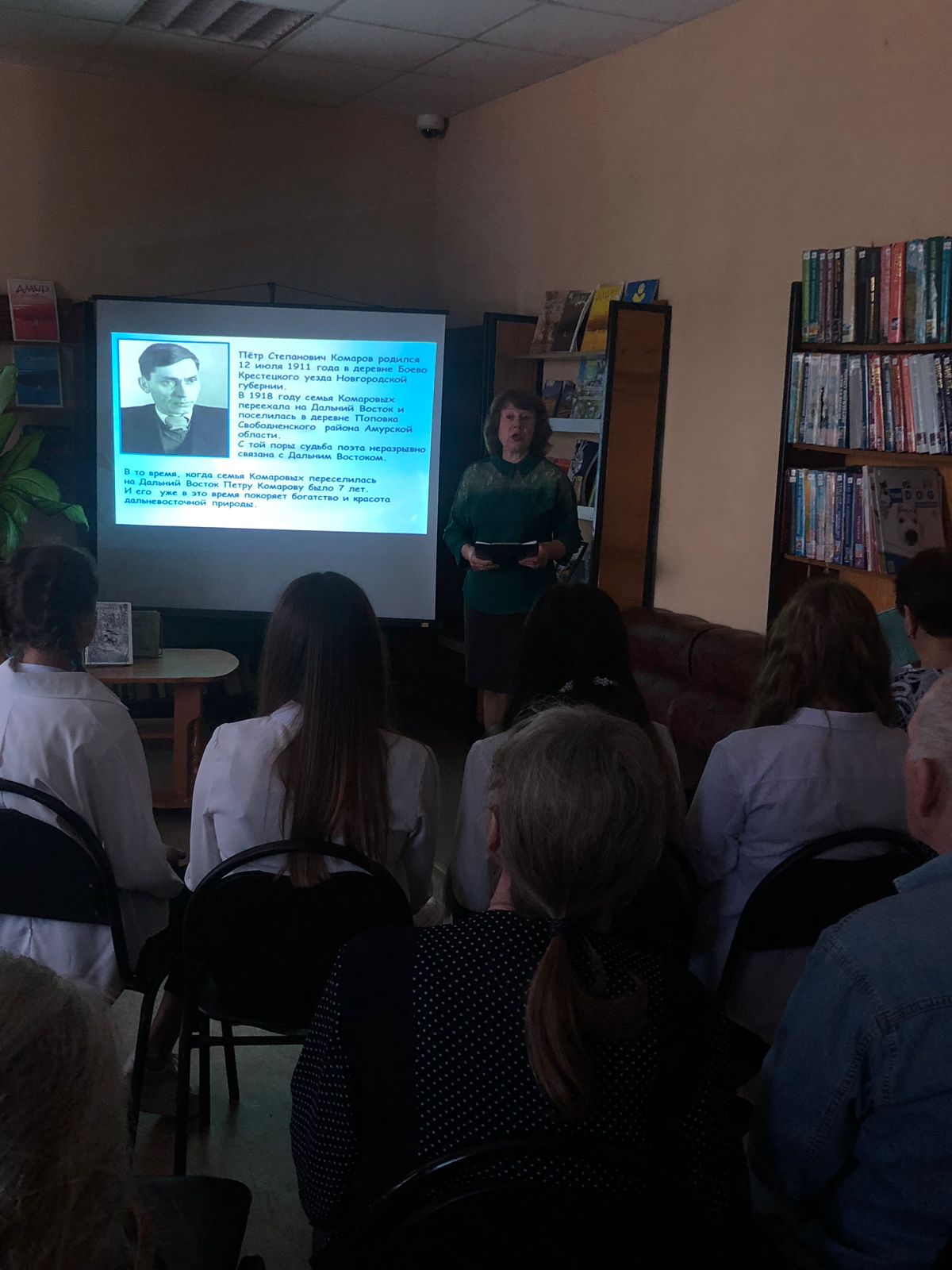 4 сентября сотрудниками Центральной городской библиотеки в рамках заседания клуба «Распустившаяся лилия» был проведён вечер-портрет «Пою тебя, мой край!», посвящённый жизни и творчеству Петра Степановича Комарова.