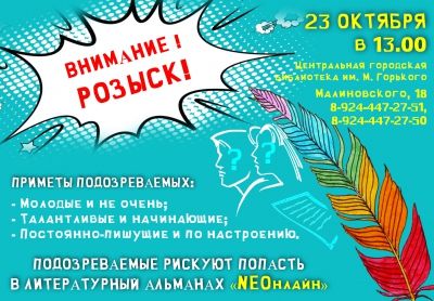 Если у вас есть своя поэзия или проза, то ждем вас 23 октября, в 13:00, по адресу Малиновского,18. Мы с удовольствием ознакомимся с каждым рассказом, эссе, стихотворением, поэмой, басней, повестью или многотомным романом!