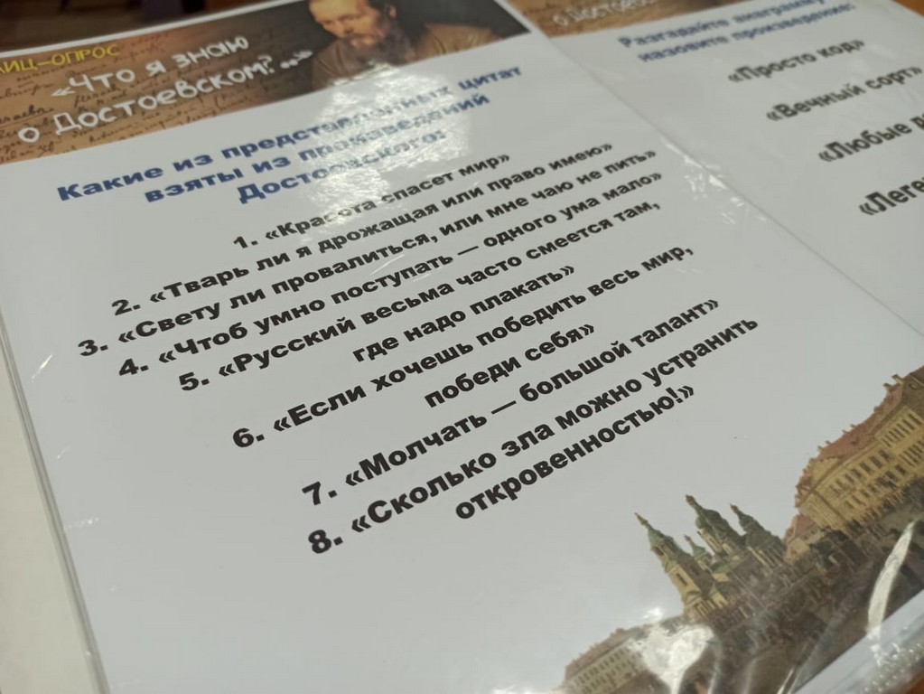 Затем, обозначив тему акции, ведущие проводили блиц-опрос «Что я знаю о Достоевском» в виде тестирования. Опрос показал, что мы не так много знаем или помним о его жизни и творчестве.