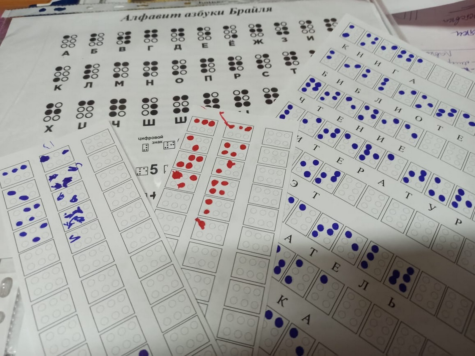 На остановке тактильного чтения «Мир на ощупь» можно было узнать, когда начала зарождаться письменность слепых, в общих чертах познакомиться со шрифтом Брайля (рельефно-точечный шрифт для письма и чтения незрячими), которым пользуются уже более 200 лет. Участники старались хоть что-то прочесть в книгах со шрифтом Брайля. Пробовали писать маркером слова по заготовленным на бумаге схемам. Или распознать на ощупь, что нарисовано на рельефном изображении.