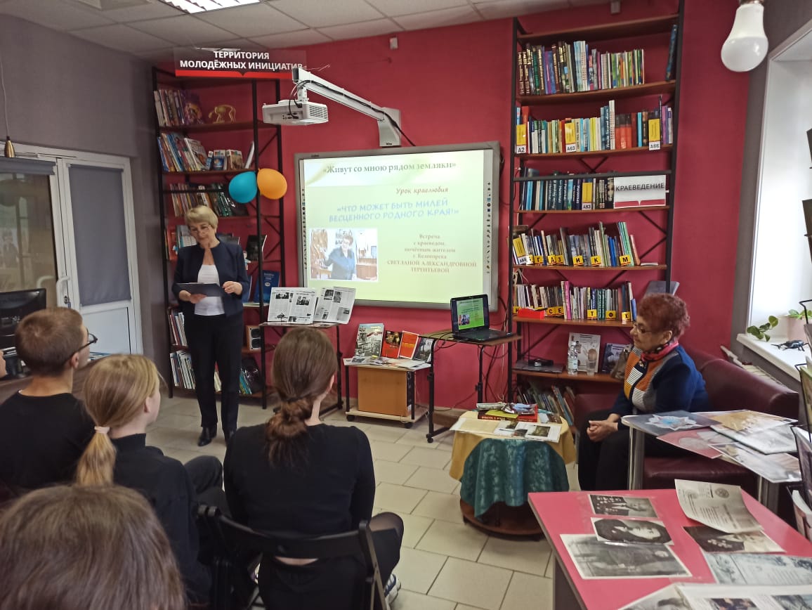 14 апреля в модельной центральной городской библиотеке состоялась встреча учащихся МАОУ «Школа № 200» под названием «Что может быть милей бесценного родного края!» с краеведом, почетным гражданином города, активным членом городского Совета ветеранов Терентьевой Светланой Александровной. Мероприятие организовано в рамках цикла встреч с интересными людьми «Живут со мною рядом земляки».