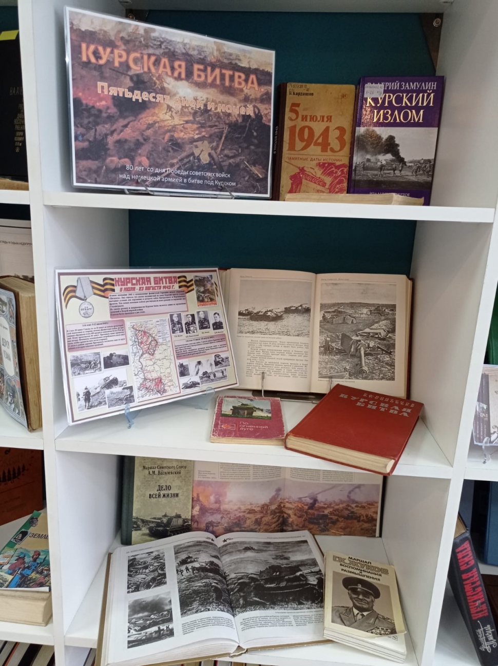 К этой знаменательной дате в модельной Центральной городской библиотеке им. М. Горького открылась книжная выставка «Курская битва. Пятьдесят дней и ночей». На выставке представлены книги, энциклопедии, иллюстративные материалы, рассказывающие о подготовке и ходе Курской битвы; мемуары, очерки.