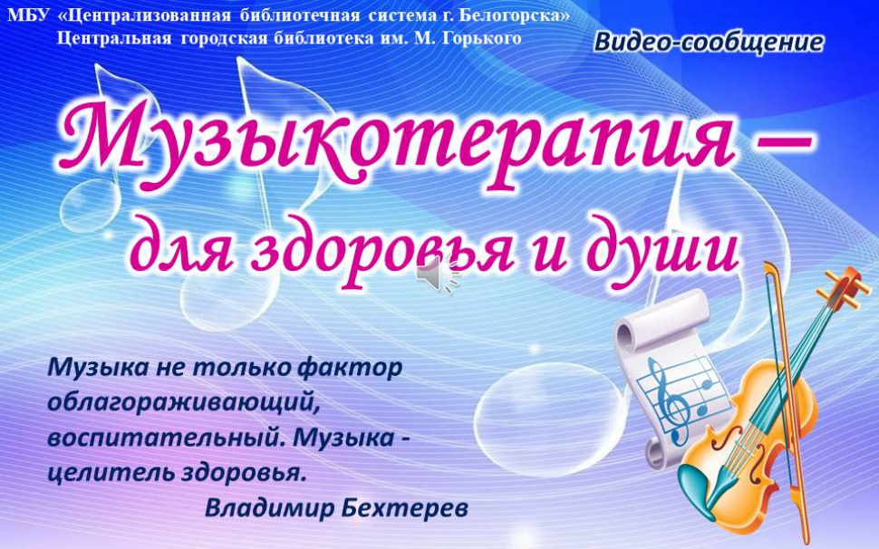 Музыка окружает человека всю жизнь. С рождения ребенок слышит колыбельные мамы, подрастая, у него появляются любимые песни. Существуют миллионы людей, которые начинают и заканчивают свой день с прослушивания музыки. Разная музыка по-разному действует на настроение, здоровье и поведение человека. В видео-сообщении предлагаем познакомиться с музыкотерапией и её воздействием на человека.