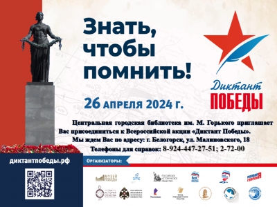 Центральная городская библиотека им. М. Горького приглашает вас 26 апреля 2024 года в 15-00 часов присоединиться к Всероссийской акции «Диктант Победы».