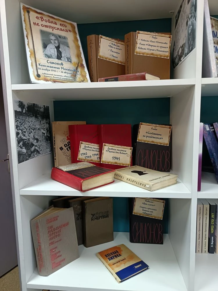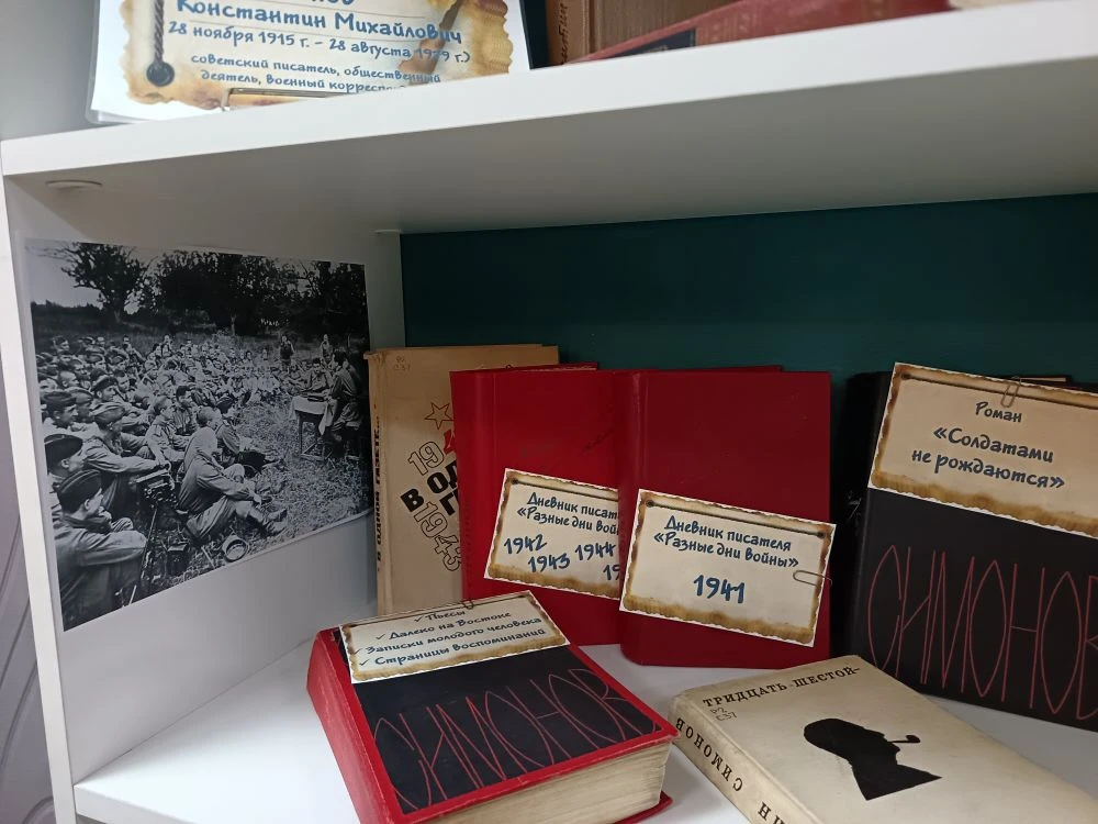 На выставке представлены биографические очерки и книги Константина Симонова, большинство произведений которого написано о войне.