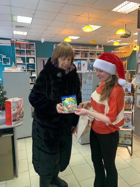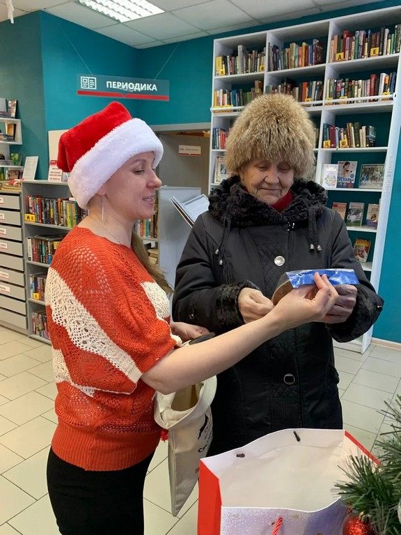 Участники акции доставали из новогоднего мешочка снежинки, на которых было указано название выигрышного подарка. Атмосфера праздника и предвкушения сюрприза создала особое настроение и сделала визит в библиотеку по‑настоящему запоминающимся.
