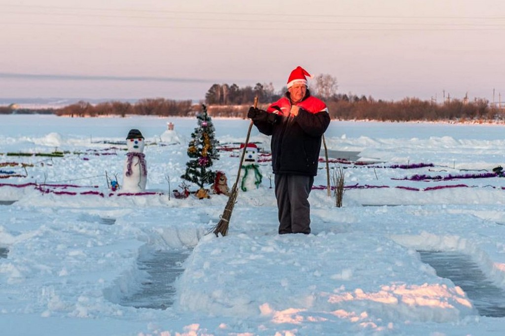 Традиция рисовать новогодние снежные открытки зародилась в Приамурье. Много лет одинокий пенсионер Валерий Мельников из села Марково Благовещенского района выходил на лед реки Хомутина и рисовал новогодние открытки. Амурский Дедушка Мороз, как прозвали в народе художника-самоучку, создавал картины при помощи метлы и лопаты. Его творения стали известны по всему региону, а затем – по всей стране. Осенью 2020 года Валерия Константиновича не стало. В память о первом ледовом художнике редакция газеты «Амурская правда» нарисовала огромного снежного Деда Мороза с лопатой на льду в его родном селе, а затем объявила конкурс открыток «Чудеса на льду».