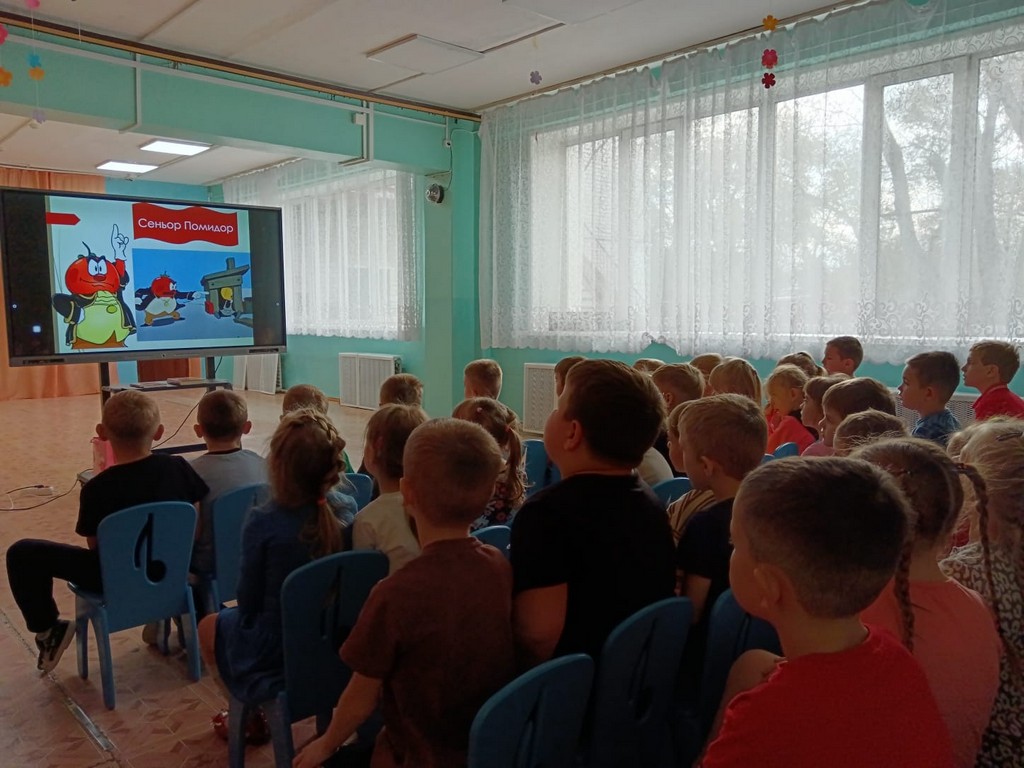 На станции «Загадочной» дети отвечали на вопросы викторины от Чиполино о героях сказки «Приключение Чиполино». За каждый правильный ответ мальчик-луковка показывал отрывки из одноименного мультфильма.