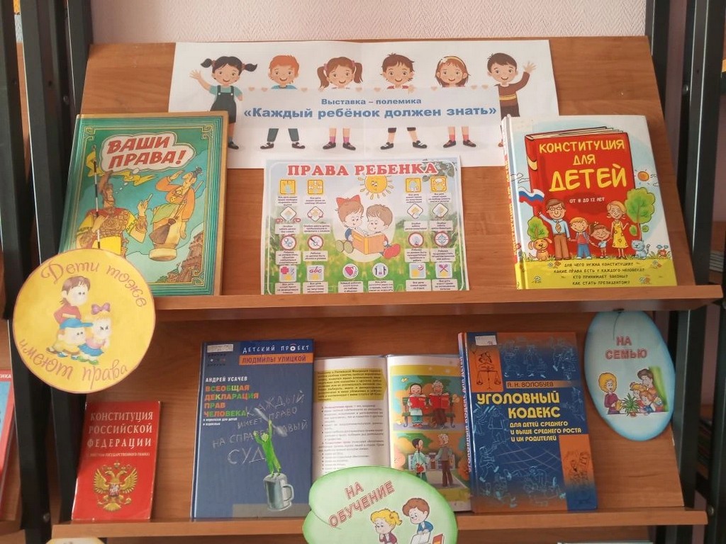 На выставке представлены книги, которые в увлекательной форме рассказывают детям о правовой жизни России, о законах, правах и обязанностях: «Ваши права»; «Конституция для детей»; А. Усачев «Декларация прав человека»; А.Н. Волобуев «Уголовный кодекс для детей среднего и выше среднего роста и их родителей»; а так же серия книг Павла Астахова «Детям о праве» и подборка журналов «Детская энциклопедия» по данной теме.