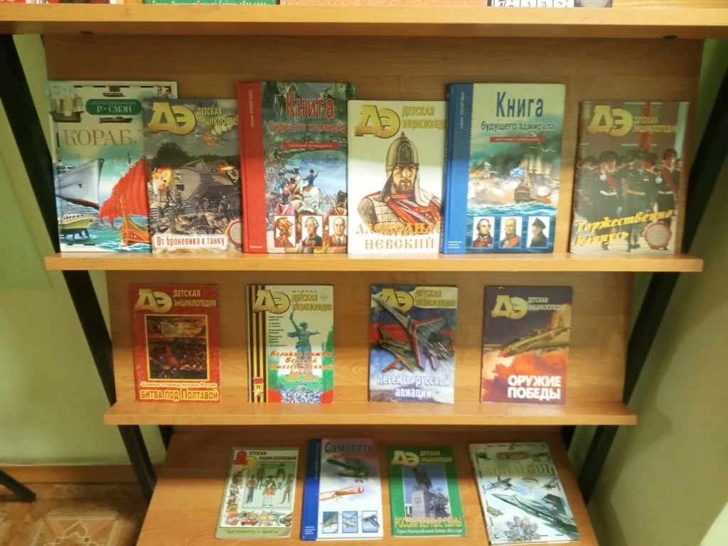 Вниманию читателей представлены современные энциклопедии «Военная техника», «Энциклопедия будущего командира», «Великие полководцы», «Рыцари», «История России» и другие. Книги, представленные на выставке, помогают совершить исторический экскурс в героическое прошлое нашей страны, узнать о великих подвигах, об известных войнах, славных победах российских войн, которые сыграли решающую роль в истории Отечества.