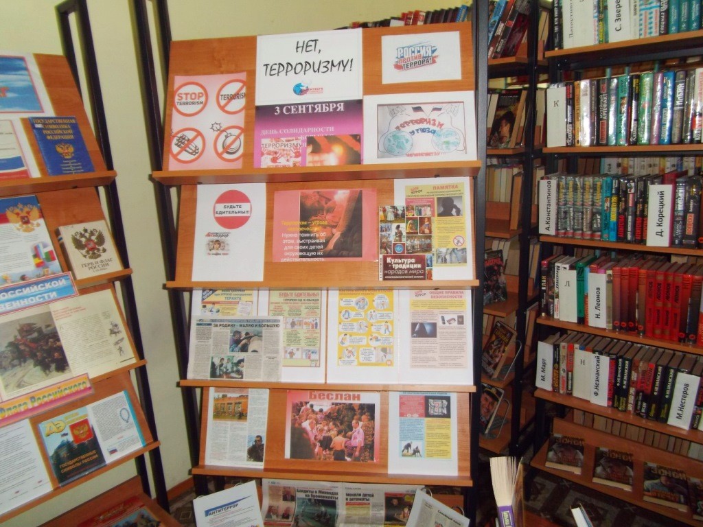 В памятный день проходят панихиды, возлагают цветы к мемориалам погибших от рук террористов, проводят минуты молчания. Выставка напоминает, что каждый из нас должен быть бдительным, чтобы обезопасить себя и других от террора. Какие меры можно предпринять, если вы оказались заложником. Выставка предлагает познакомиться с памятками «Что такое терроризм?» и «Будьте бдительны», статьями из газет и книгами на данную тему.
